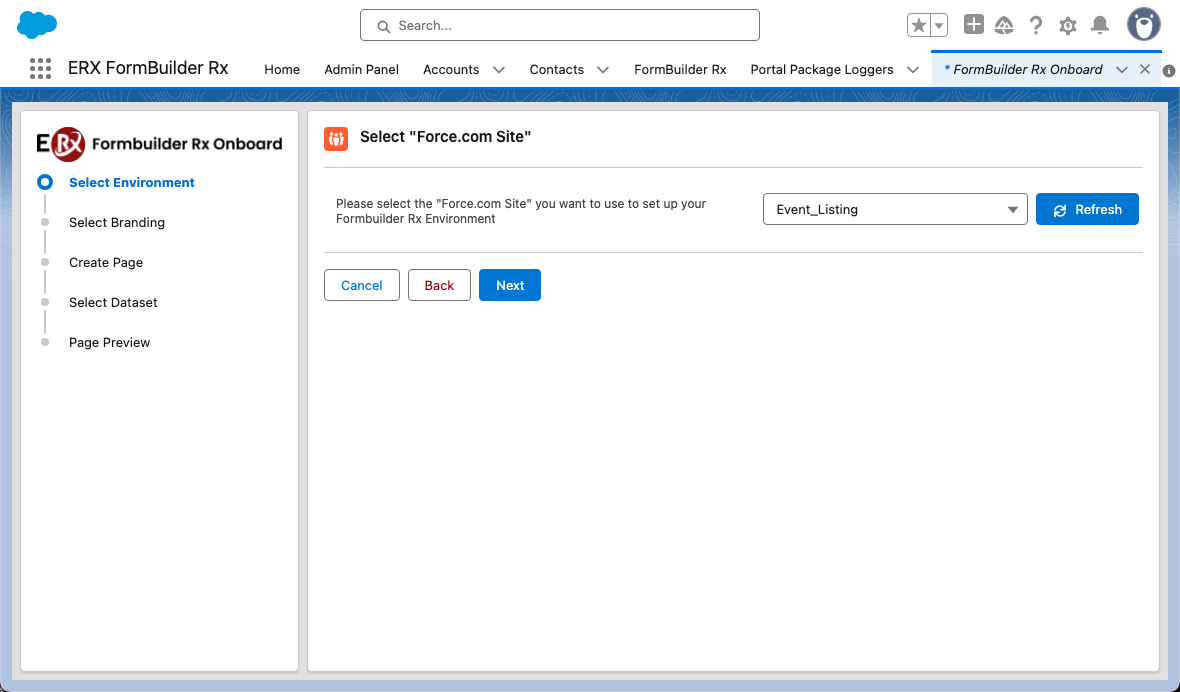 Tip:After completing each step in the wizard, the left side panel will update automatically to show your progress. - Choose the Force.com Site option and click Next.