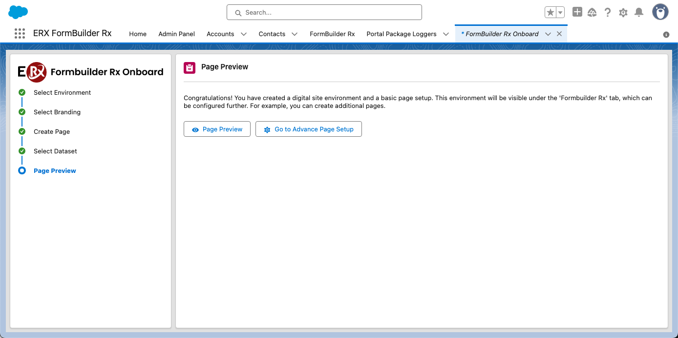 Important:Specific permissions are required to preview a Force.com site from the Onboarding Wizard. You'll know whether these permissions are configured if the Page Preview button launches a front-end view of the page. If not, and you see an error, these requirements and instructions will help you troubleshoot. - Clicking Go to Advance Page Setup on the Page Preview screen will open the