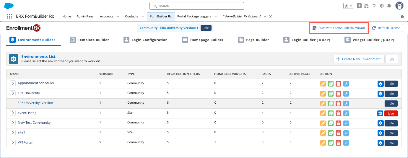 - Alternatively you may delete the environment from the Admin Panel and then restart from scratch by clicking the Start with FormBuilder Rx Wizard button.