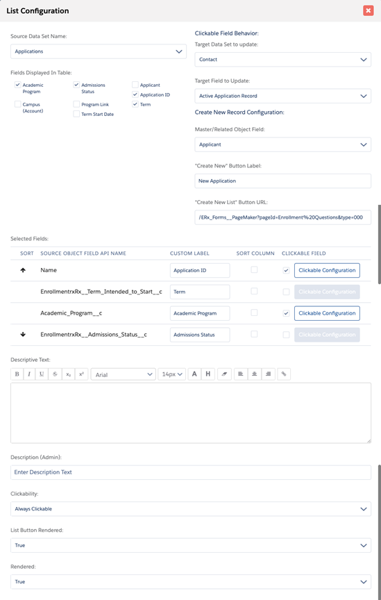 Before creating this component, there should be two data sets created. First, there should be a child object data set on the Application sObject which contains the fields you want to display on the list of Application records, including the field that looks up to the parent Contact object. Any Child object field configured as a lookup to the Parent object may be referenced for use in this component, but normally this would be the Application’s Applicant field. Be sure that the record Criteria(s) for this data set are set to retrieve all of the records that need to be listed on the page, that is, all the applications that belong to the logged in Contact/Portal User.