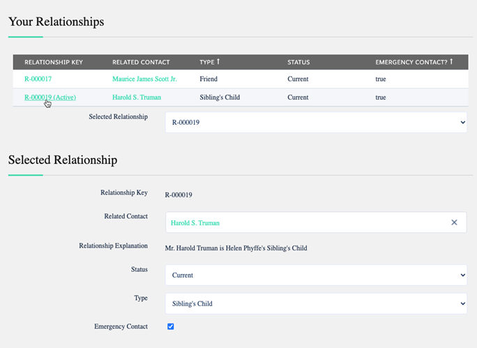 Consider the EDA data model, where the Contact can have multiple Relationship records looking up to it. You would like to display a list of the logged in Contact’s relationships and when the user clicks on a relationship, you would like to display beneath the list, various fields of information from the Relationship record. You display the related contact’s name in one of the list columns and when the user clicks a name, they are redirected to a page that displays many fields of data from the related Contact record.