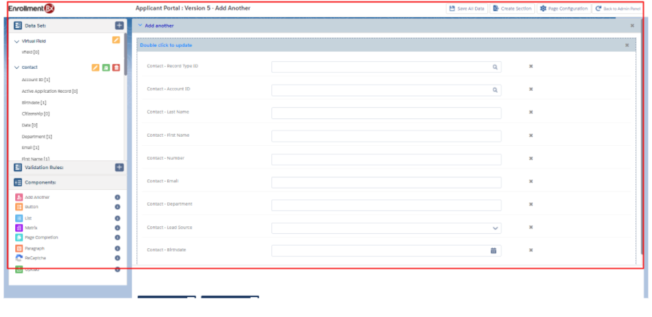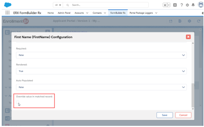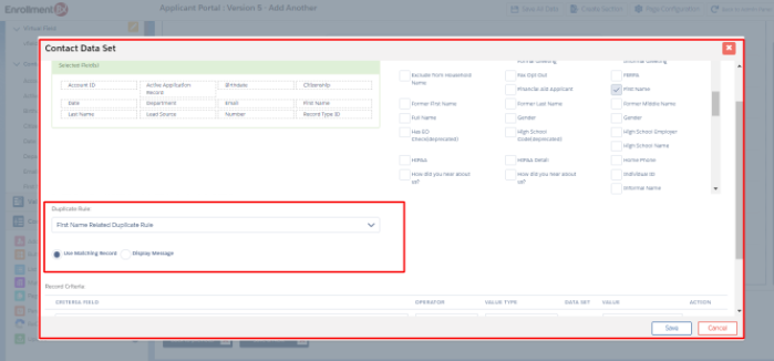 If the end user creates the contact with same First name as “Erin”, then these field values: Department, Lead Source, Birthdate, and Account will get overridden with what the end user enters into the above form fields on the front end.