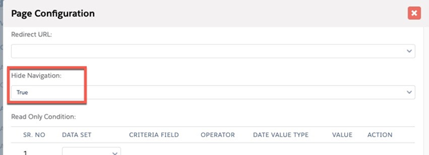 - Under Page Configuration, set “Hide Navigation” to true: