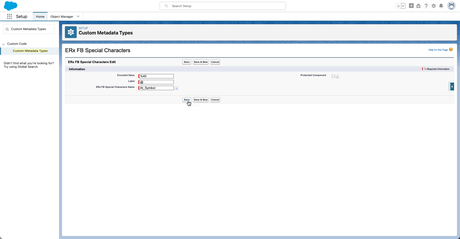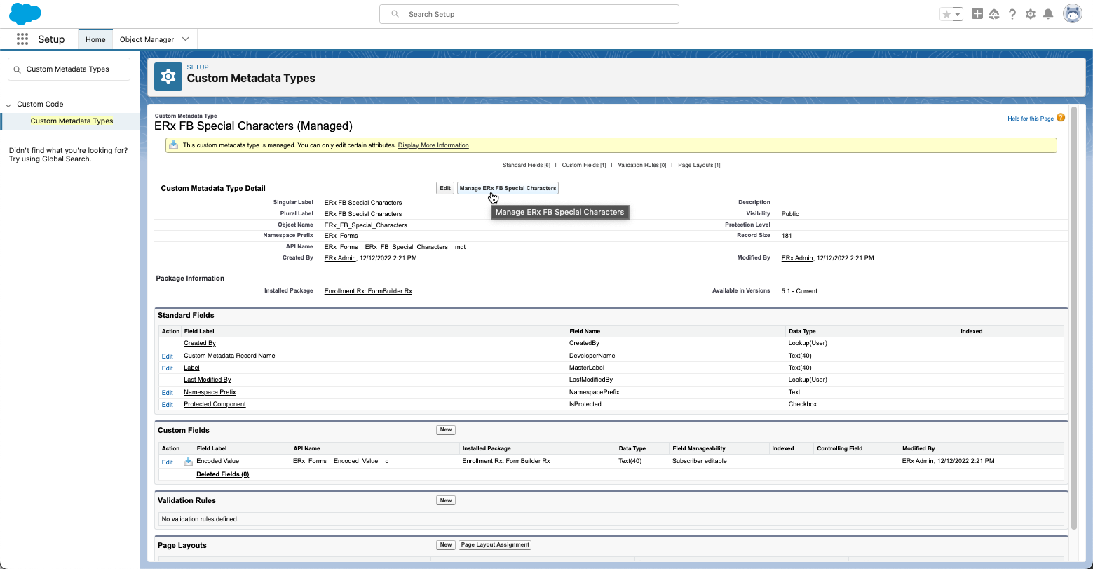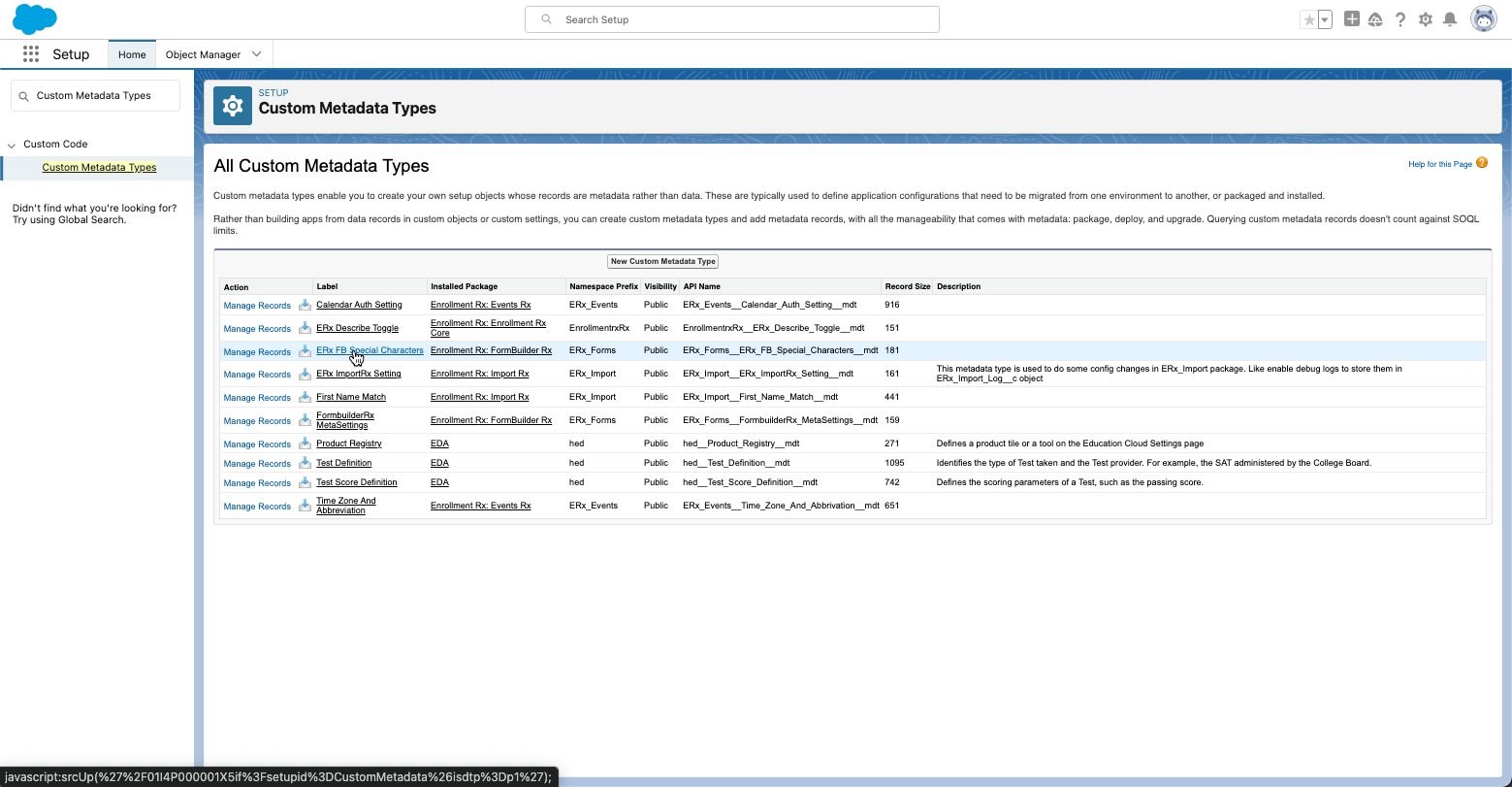 - On the All Custom Metadata Types page, click on the Label for ERx FB