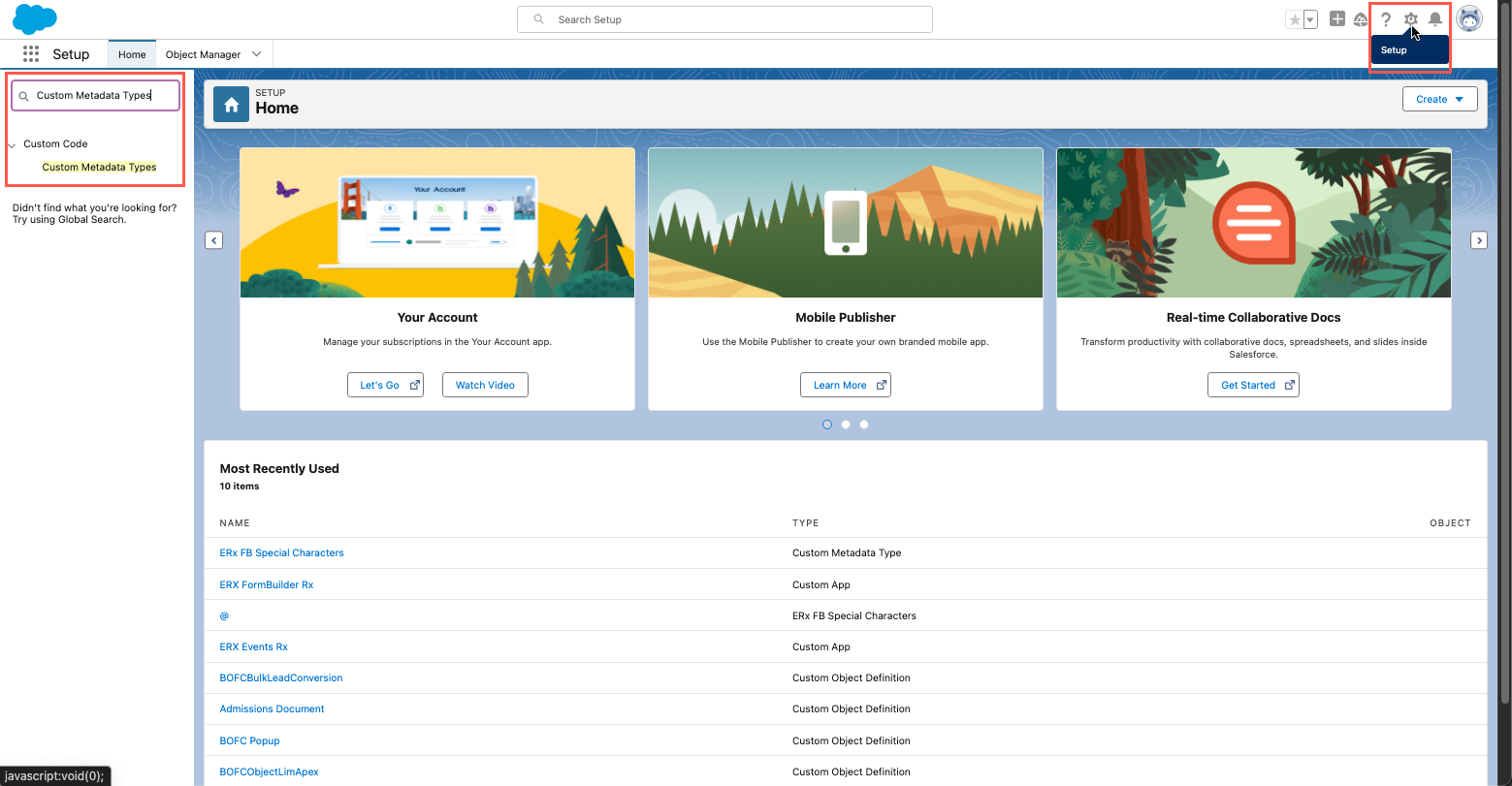 - In Salesforce, go to Setup and search for "Custom Metadata Types" in the