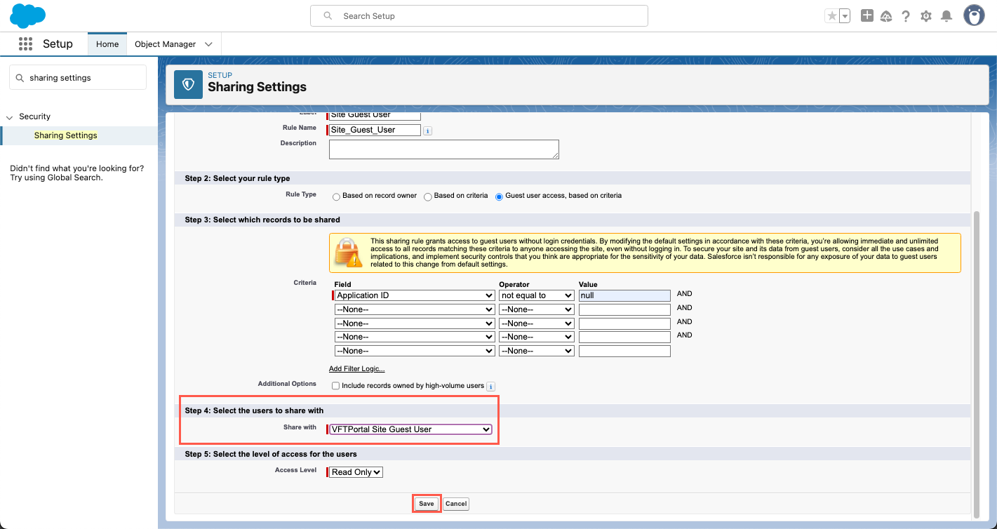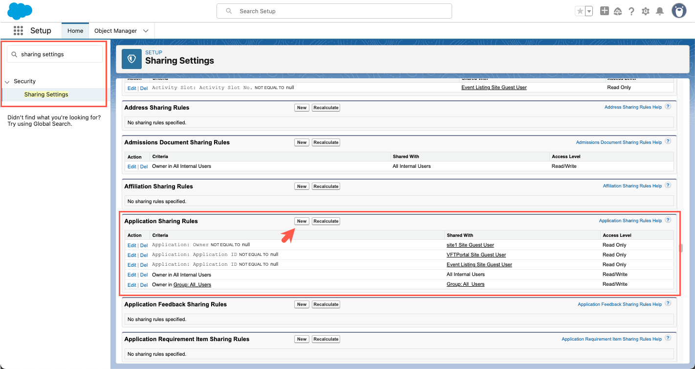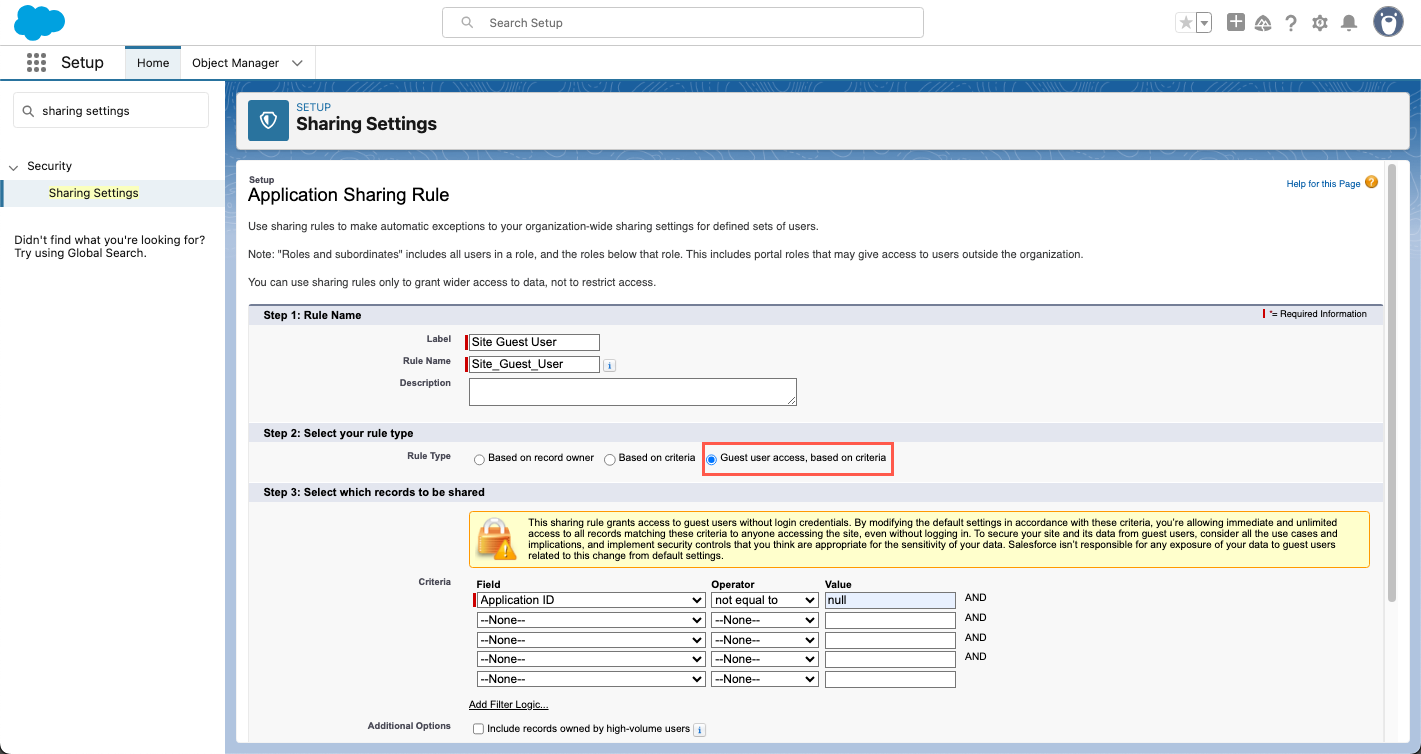 Sharing Rules grant access to FormBuilder Rx’s objects that each Site Guest User must be able to read.