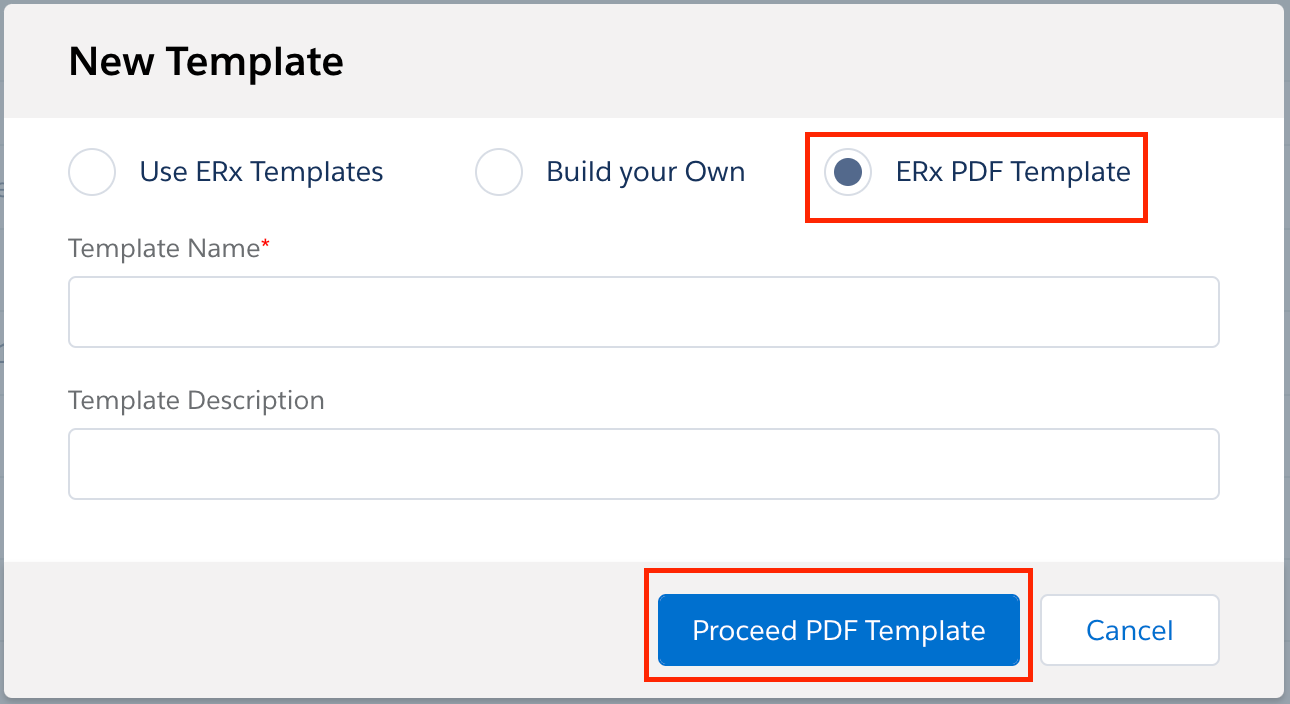 - A required field labeled "Template Name" is available while selecting an ERx PDF
