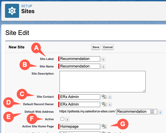 | E. | Default Web Address | The unique salesforce-site.com URL for the Site. |