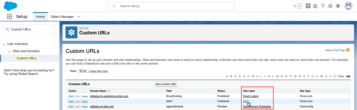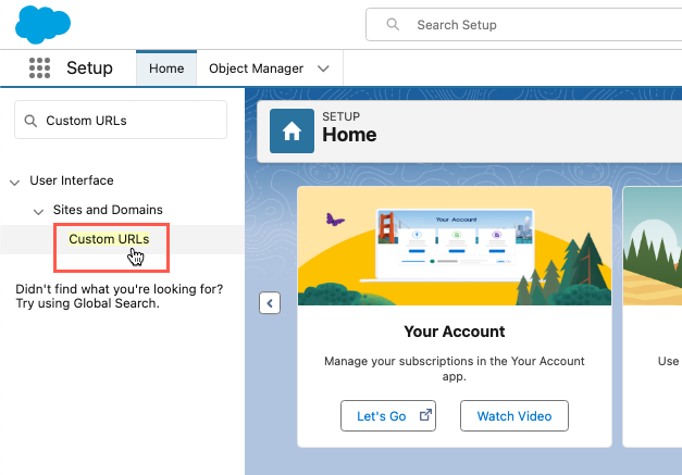 - Go to Setup and search for "Custom URLs" in the Quick Find box.