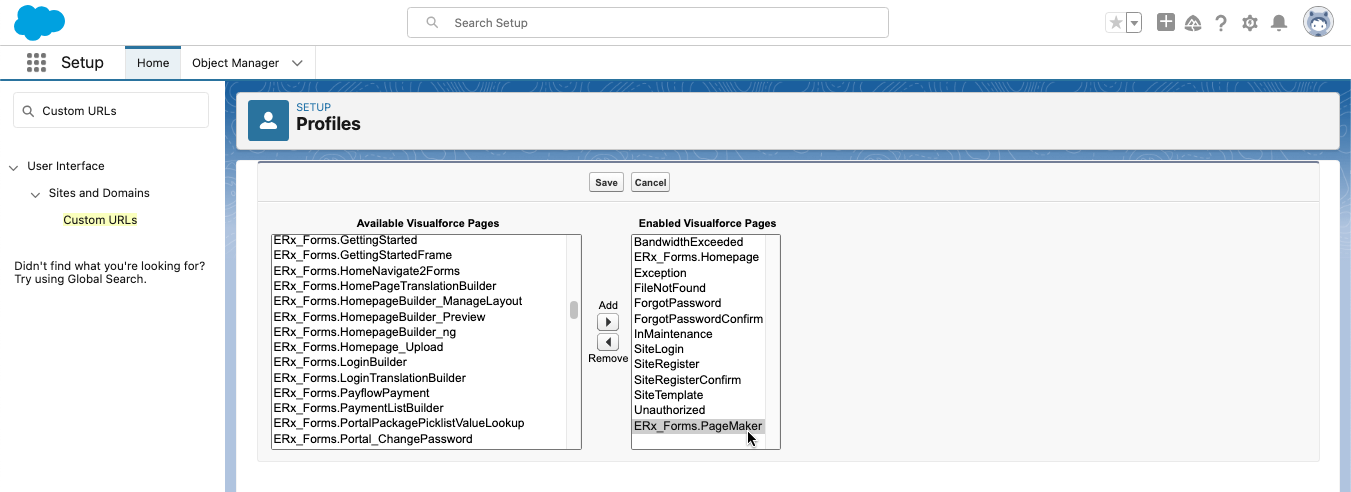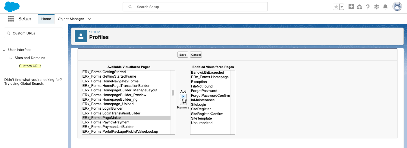ERx_Forms.PageMakerto highlight it. Click the "Add" button to move it to Enabled Visualforce Pages.