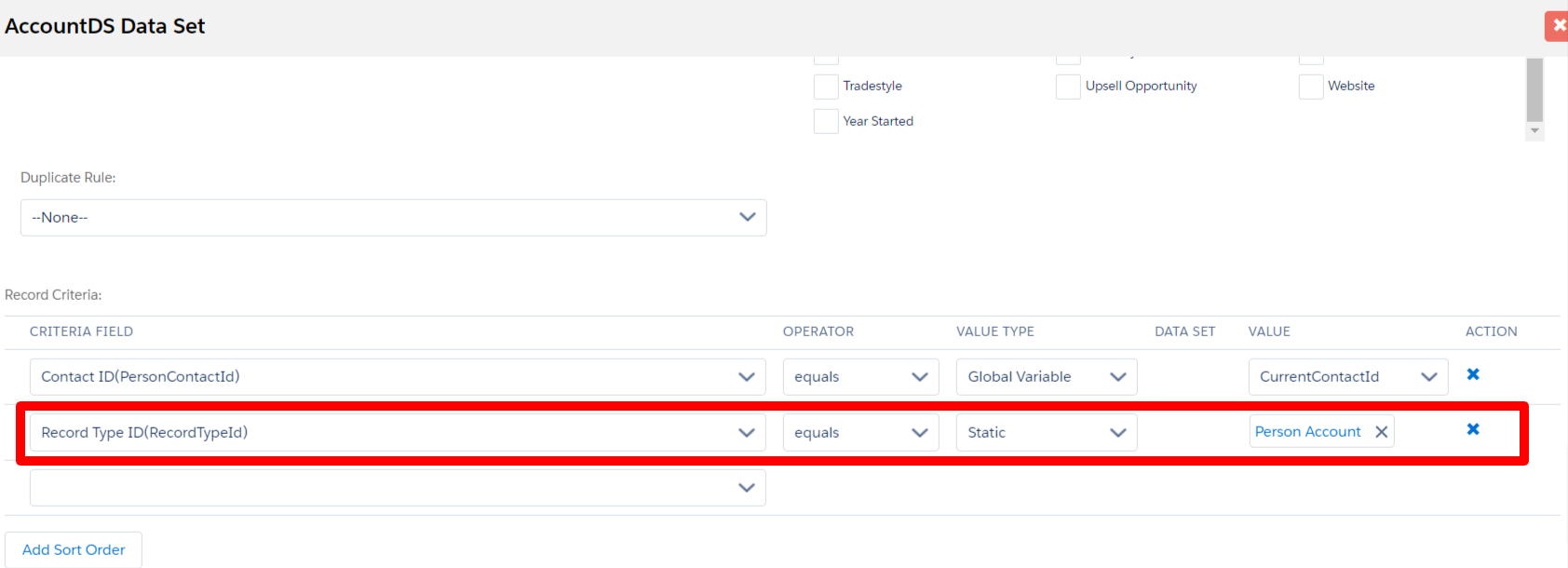 | Data Set Criteria | Account ID Equals - Data Set - Account - Account
