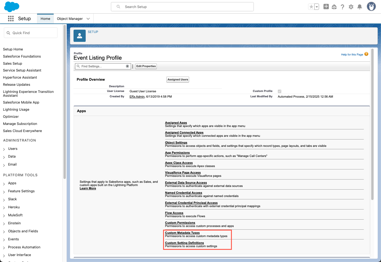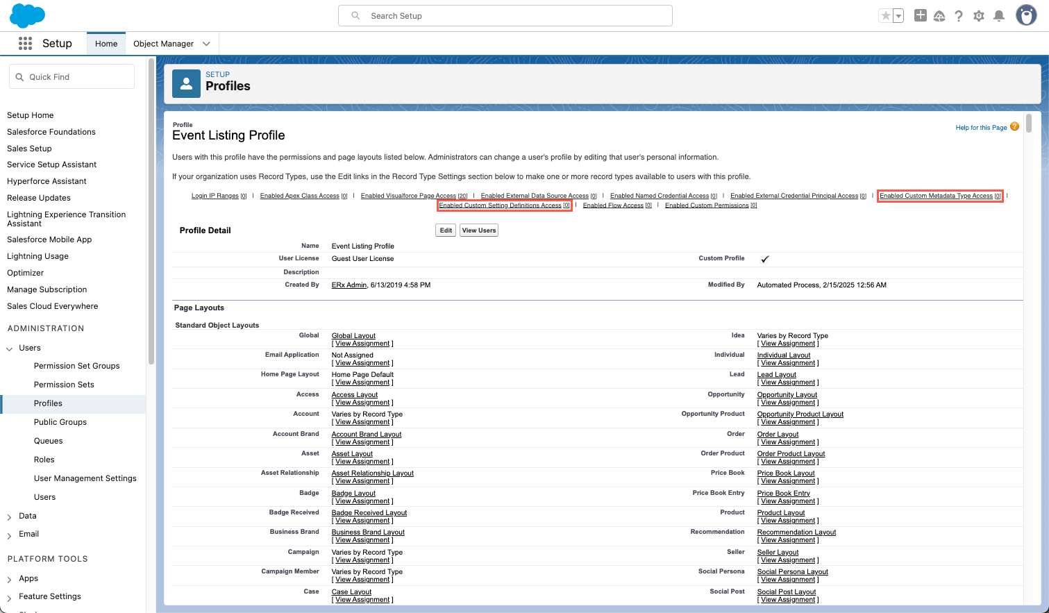 - Repeat steps 7 and 8 with Enabled Custom Setting Definitions Access and