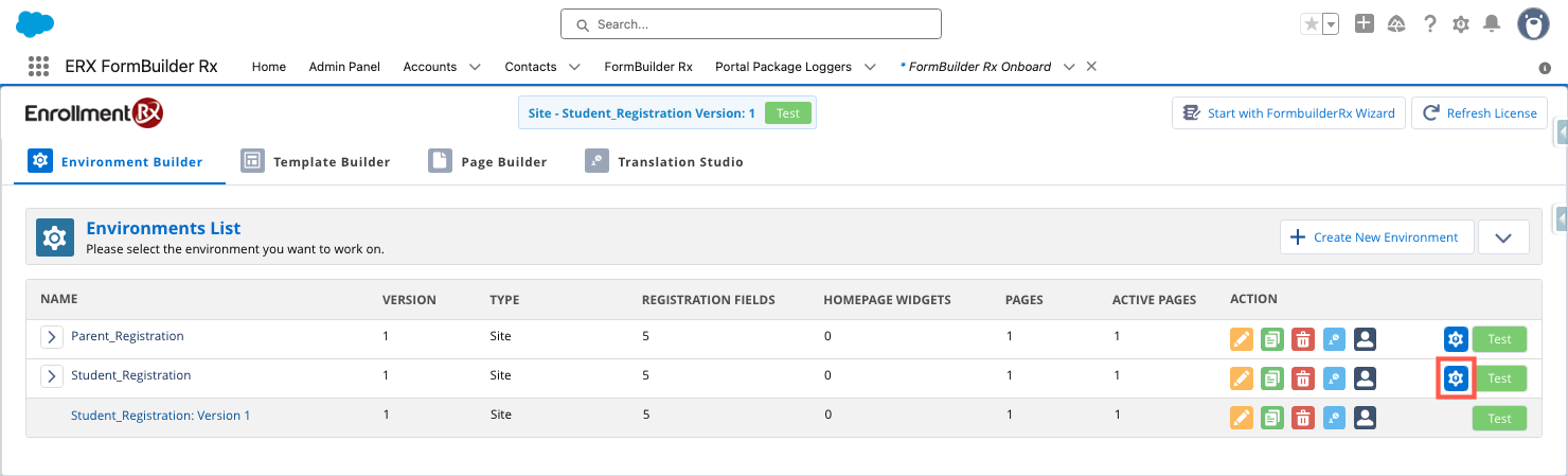 - On the FormBuilder Rx tab, click the gear icon in your selected Environment.