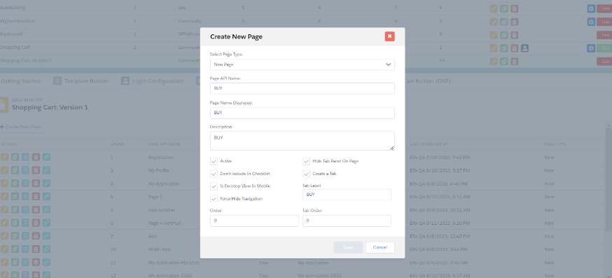 - On the Page Builder tab, click the Create a New Page button, give it a