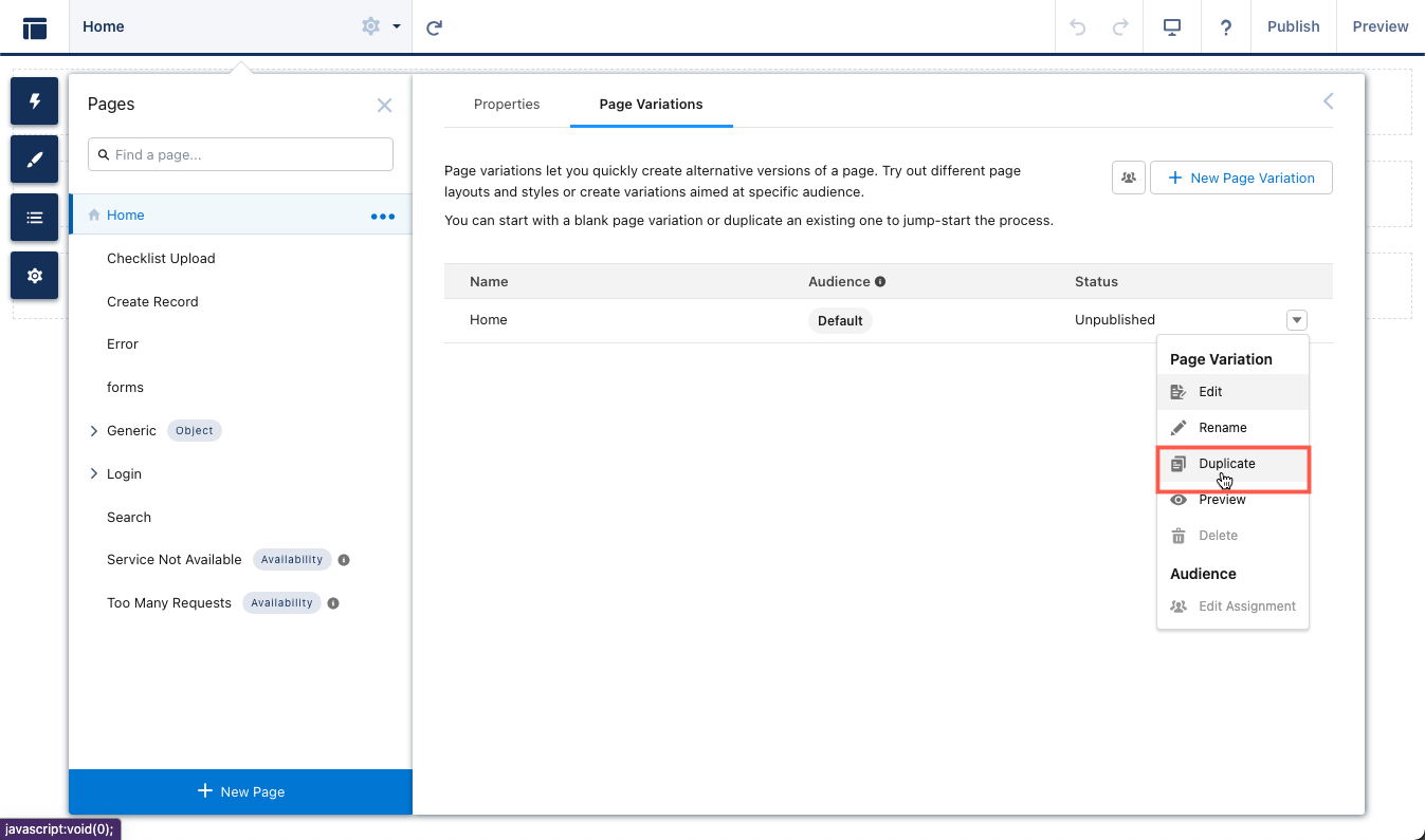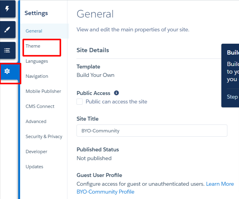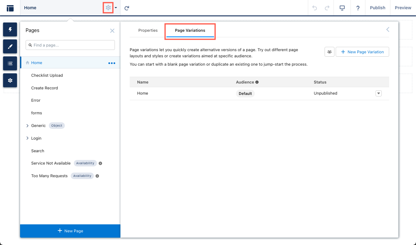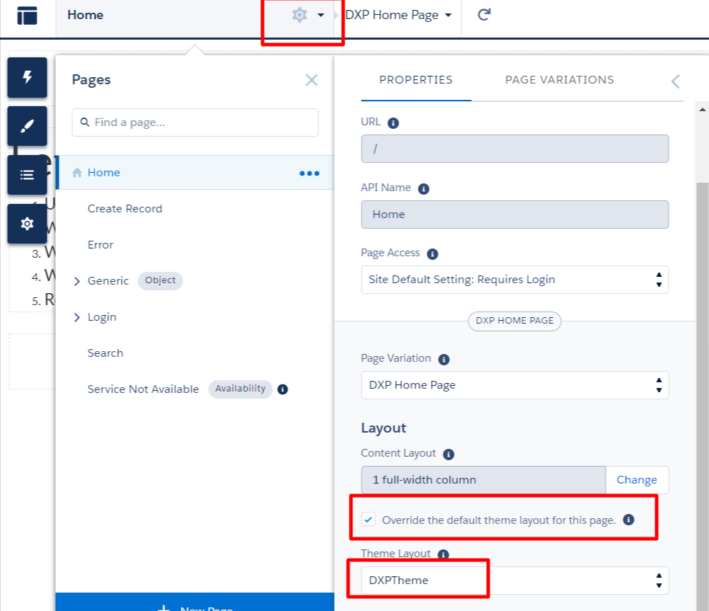 - In Experience Builder click the Home gear icon (labeled "Page Properties") and select the Properties tab