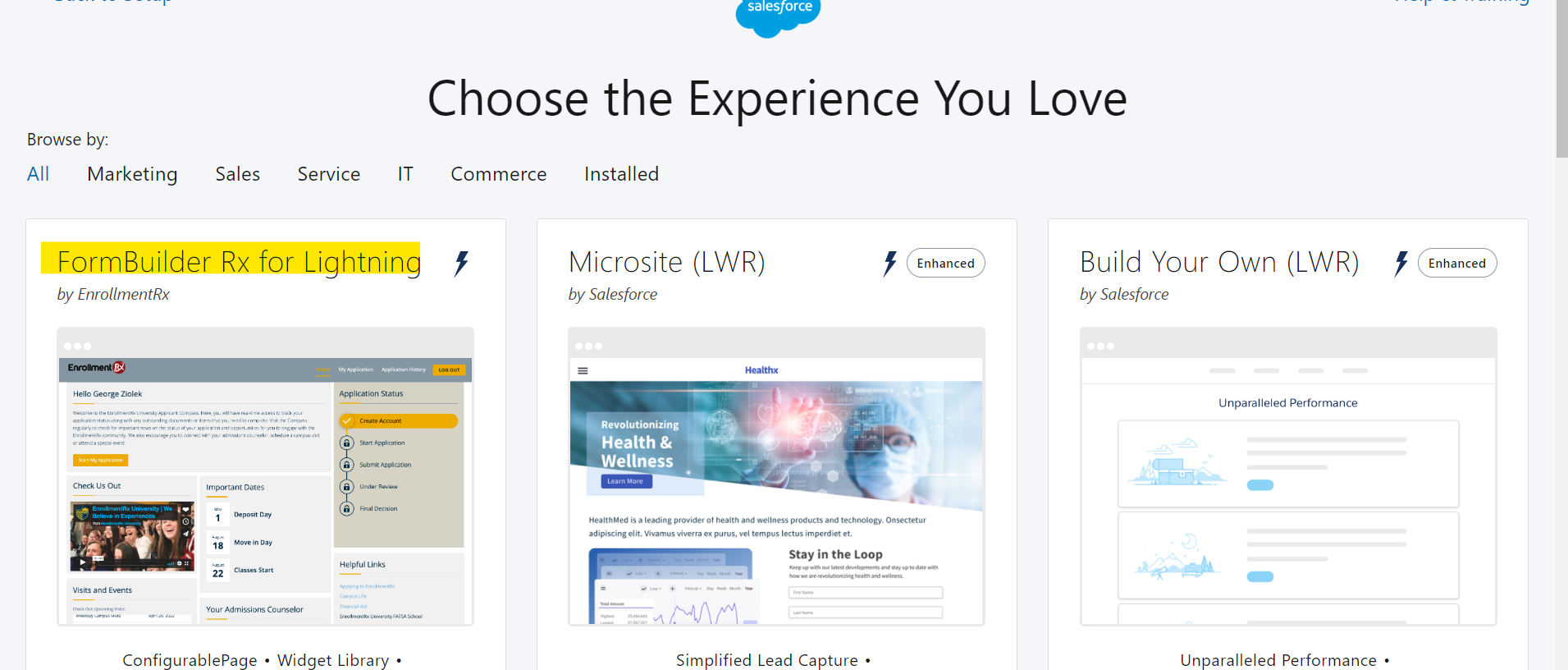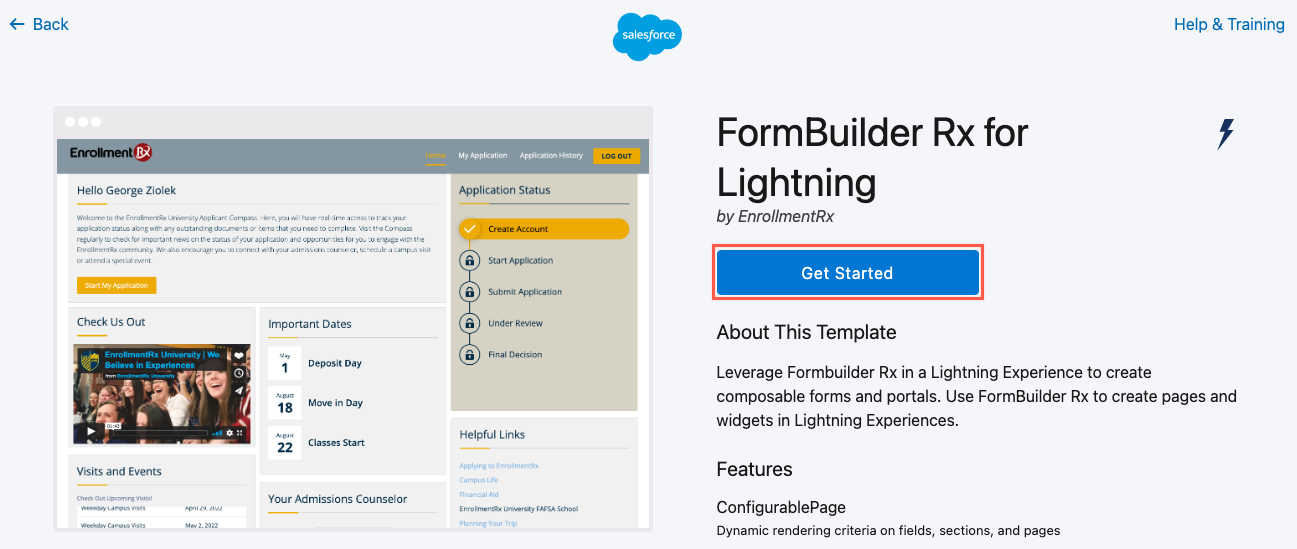 Tip:We suggest using the “FormBuilder Rx for Lightning” template to avoid extra steps for login, registration and branding pages. - Click on the template and click Get Started