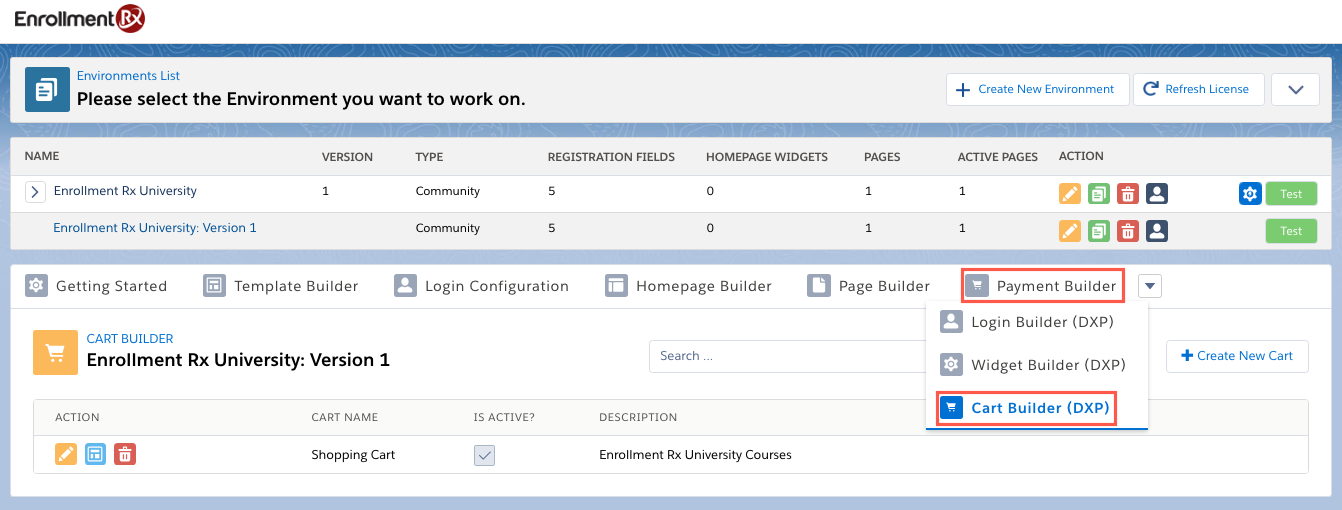 The Shopping Cart feature must be enabled by the ERX support team before you can start using it. After you have installed or upgraded the appropriate versions of FormBuilder and DXP, send an email to support@enrollmentrx.com with your Salesforce Org ID.