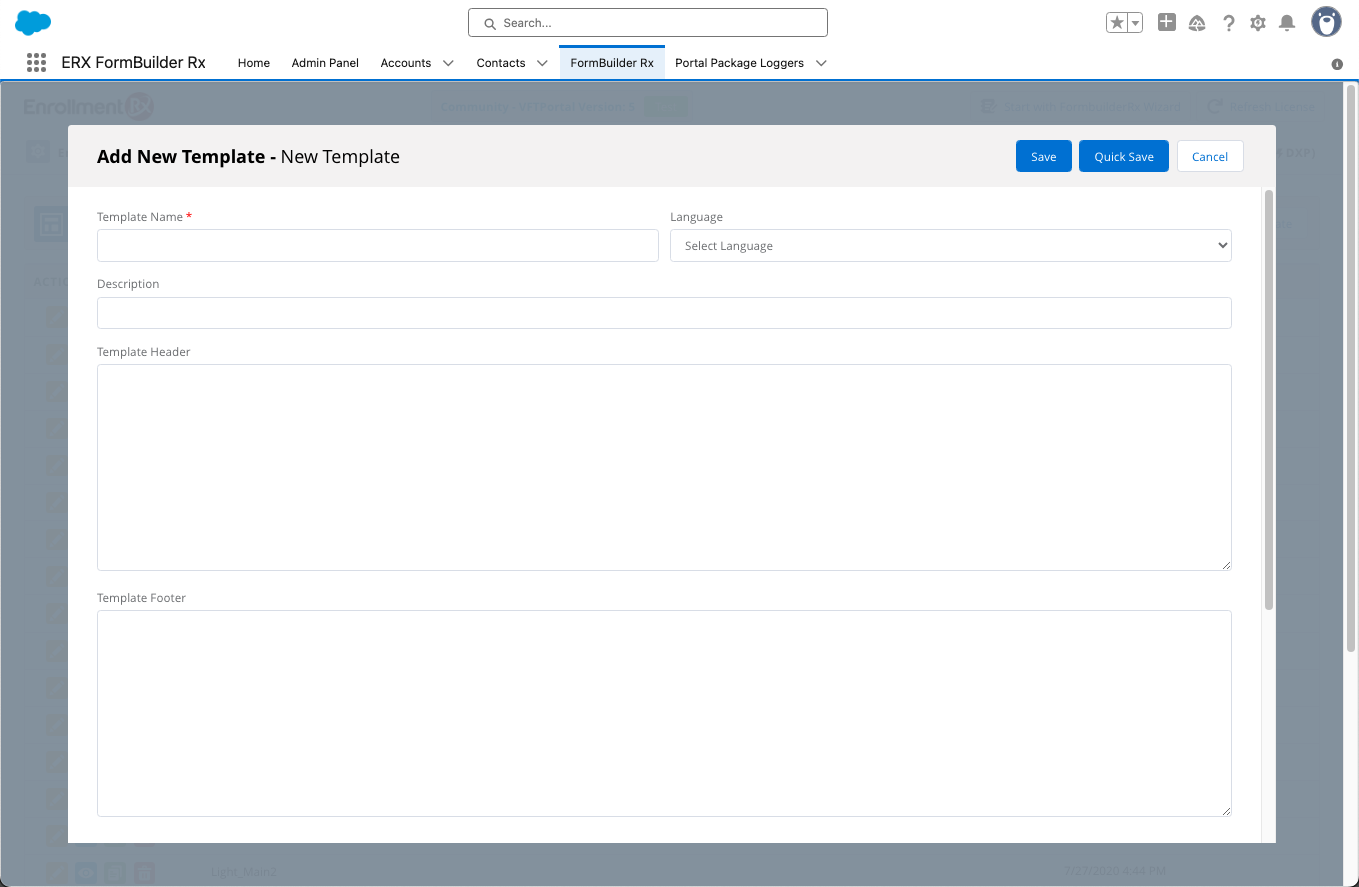 - Click the Template Builder subtab, then click the New Template button. This will launch a popup.