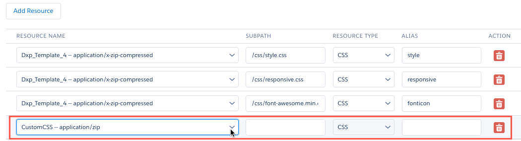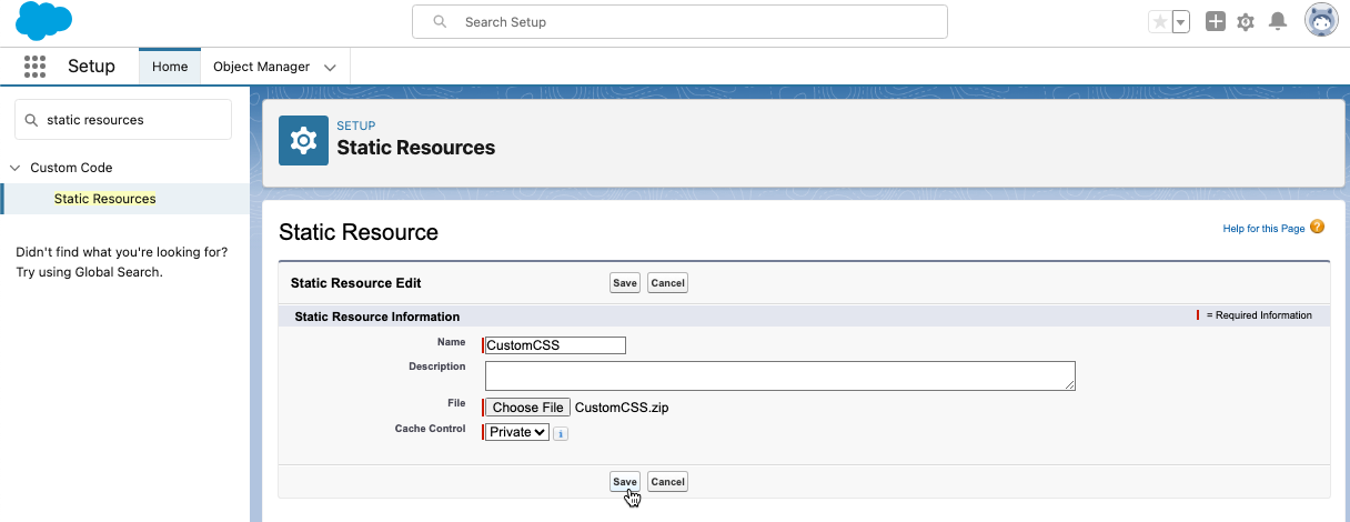 - Upload a zipped file (e.g., with your custom CSS) to Static Resources