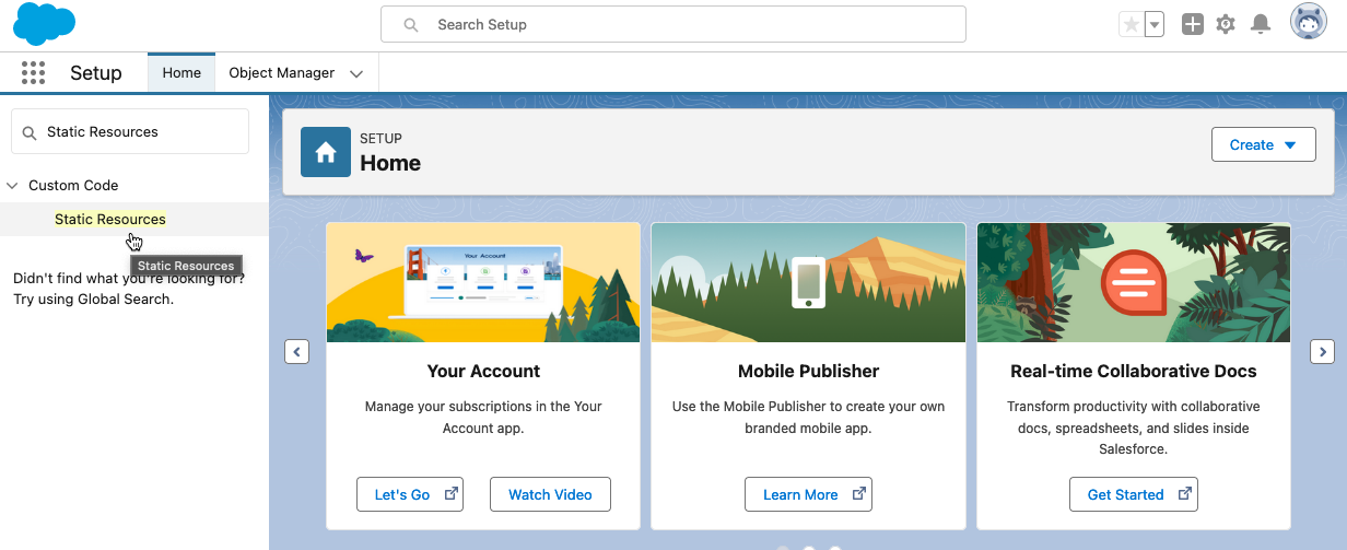- In Salesforce, navigate to , type "Static Resources" in the Quick Find window and click