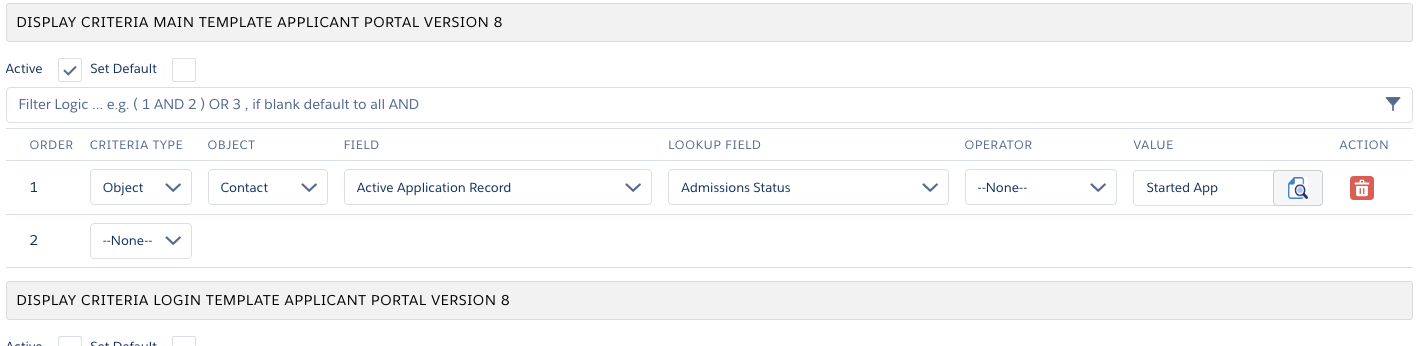 In the illustration above we have specified that if the Contact’s active application’s Admissions Status = “Started App”, then use this template. You may use any number of criteria arranged in any valid logical expression to control the appearance of a template.