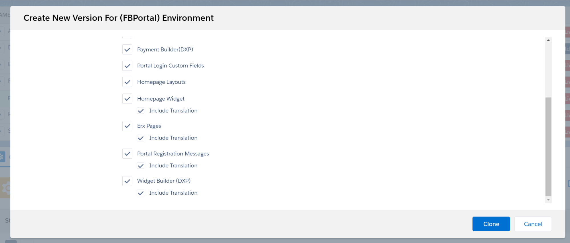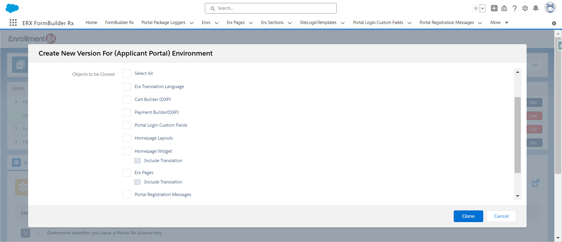 Note:The Translation option should be editable only when the respective clone option and ERX Translation is selected.In the popup, select the following checkboxes: