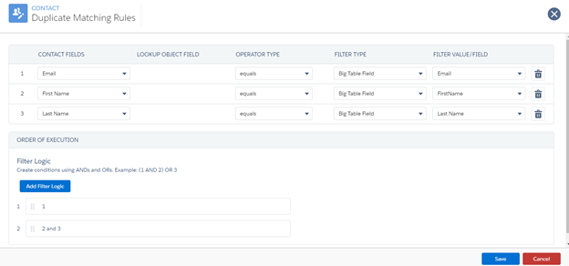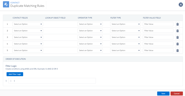 - Order of Execution and Filter Logic (bottom of dialog): Use “AND” and “OR” to set the logic for evaluating the criteria. Multiple Rows of filter logic can be added, in which case they are evaluated in sequence, with 1 being the highest priority. Once a match is found, the evaluation stops.