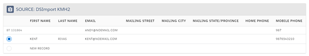 When duplicate Contacts must be resolved, the Duplicate Review Screen is displayed. This page is divided into sections: one for each Data Source. The columns displayed in each section are the ones chosen on the Data Source screen (Fig 1.2). On this page, you choose which of the possible duplicate Contacts to update, or to create a new record, rather than updating any of them. The possible duplicates are selected by the Data Source’s duplicate matching rules for Contacts.