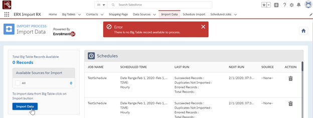 Click on the the Import Data button to bring up a screen that will allow you to begin the import. Check the box next to each data source you would like to import. An error message will display if there are no Big Table records available to process (Fig 2.23).