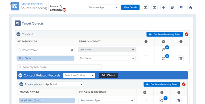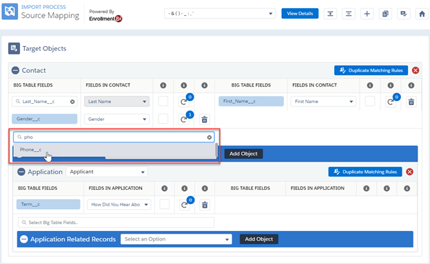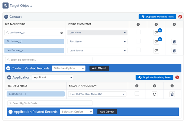 To change the target field, click the “Fields in [object]” picklist and make a selection. The fields displayed are specific to the object that is being mapped. The same Big Table field can be mapped to multiple target fields (Fig 2.10).