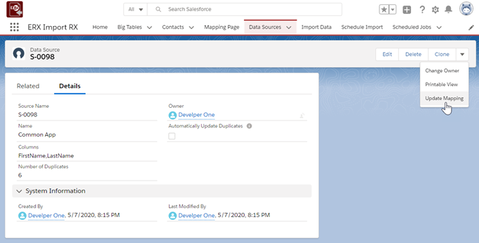 This is the page where the mapping between the Big Table fields and target objects and fields are defined, specific to a Data Source. The page can be opened by opening a Data Source record and clicking “Update Mapping” (Fig 2.7) or by clicking the Mapping Page tab. If no Data Source record exists, you will receive an error and be prompted to create a new source.