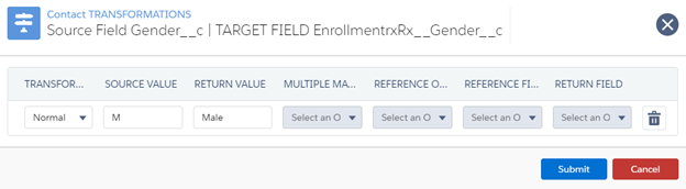 Choose which type of Transformation you would like to map (Normal or Reference) and configure the appropriate values in each column. Additional rows are added automatically when you click in the last row. To remove a row, simply click the Trash icon.