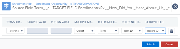 When you are importing text values but need to populate lookups (for example you are importing the names of terms such as “Fall 2020” but you need to populate a lookup to the Term object), then you will need to configure a transformation for that field of type “Reference”, as shown in Fig 2.22.