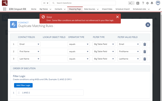 The dialog pictured below pops up when you click the “Duplicate Matching Rules” button in the top right corner of each object mapping section. By default there will be several rows available in the dialog to fill out. Each row is numbered, and it is this number that must be referenced in the Filter Logic at the bottom.