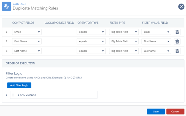 The first column contains fields, with the options being dependent on which object you are adding the duplicate matching rule to. If a lookup field is chosen, the second column “Lookup Object Field” will populate with fields on that object that can be used. Choose an Operator Type to compare the value chosen in column 1 with the value chosen in column 5. Filter Type allows you to determine if this last value is a static value or a value from the Big Table (pictured below).