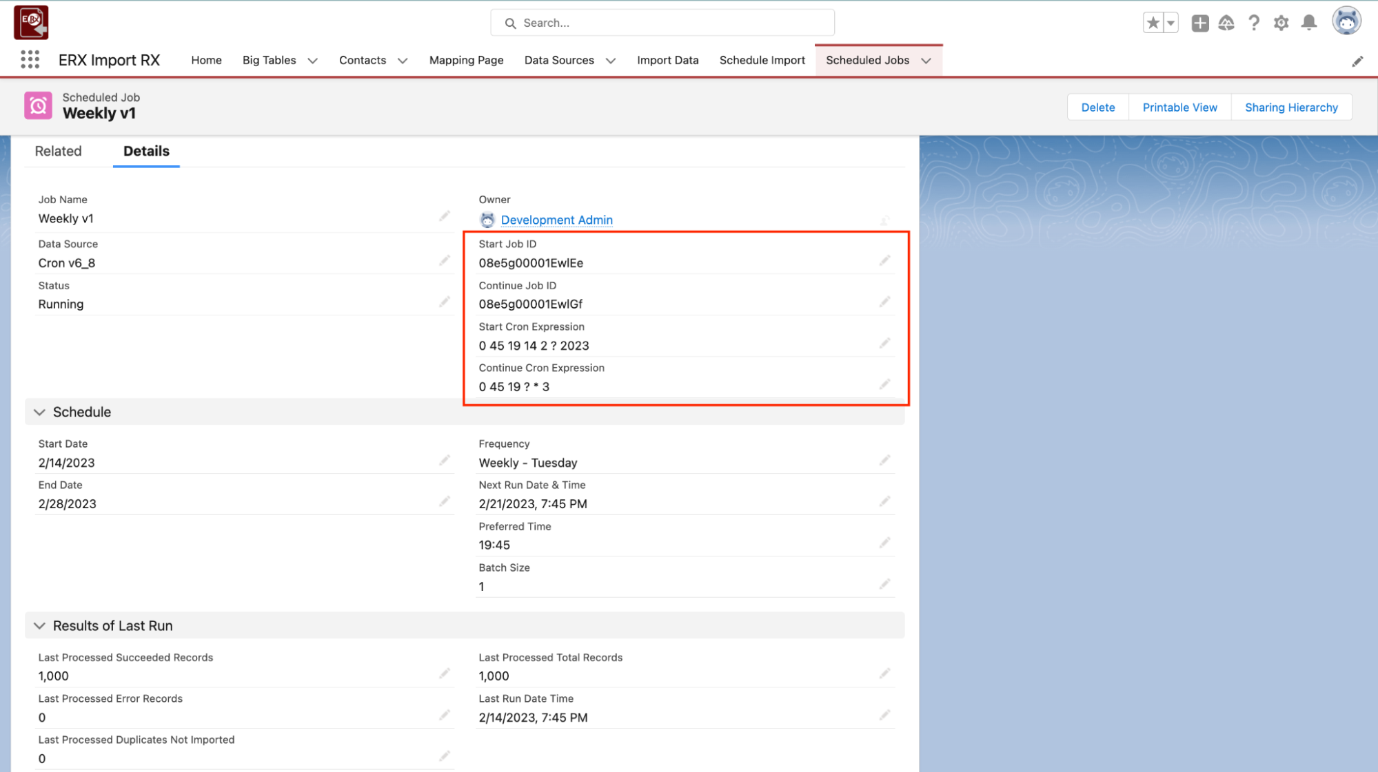 Now, when a Job is scheduled for any frequency, only one scheduled job record will be created. On the Salesforce back end, Import Rx will create two scheduled jobs.
