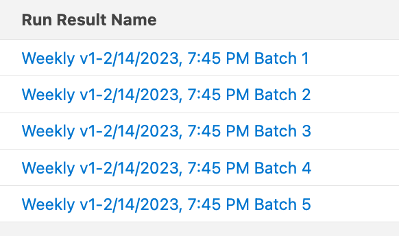 For multiple run results, a batch number will be appended to the result name like this: Job Name + Current Run Date Time + Batch {Number}