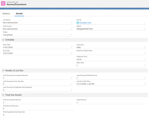 The Scheduled Jobs tab contains the back end records that are created from the Schedule Import tab. These records should never be manually edited. However, for completed schedules they may be deleted if the historical information is not of any use. Deleted records will also be removed from the “Schedules” section of the Import Data tab. The Status field provides information as to where the job is in its progression: