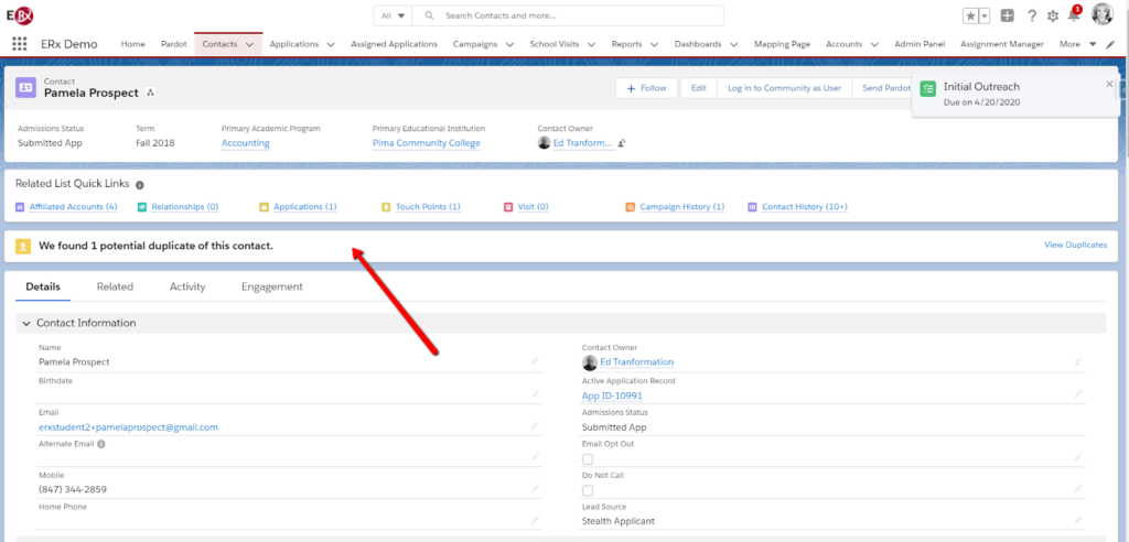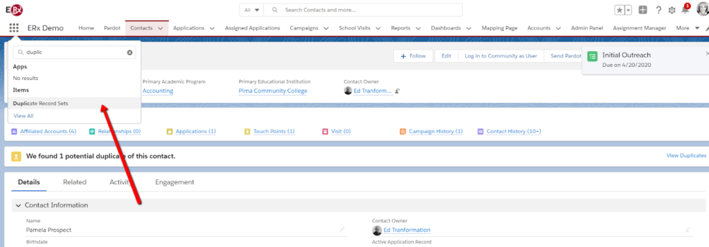 If a contact is not flagged automatically, you can still merge two known duplicate contact records. Following are the steps.
