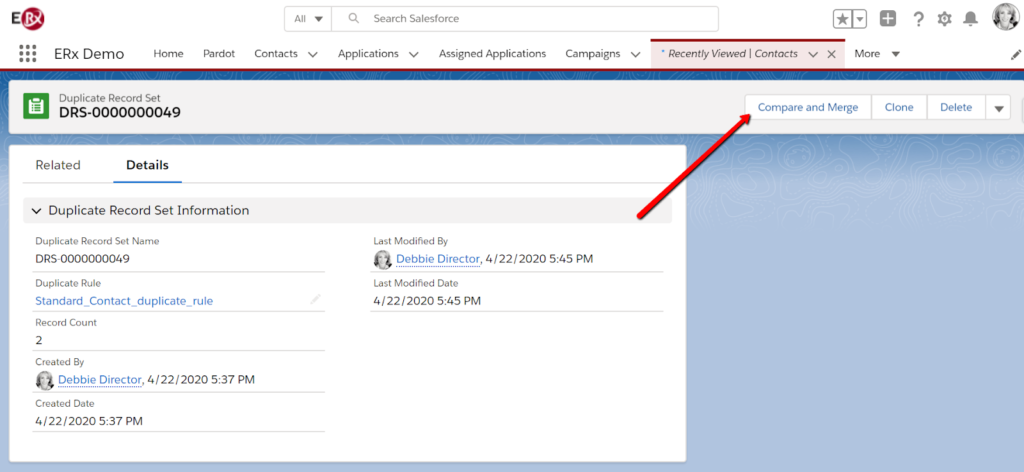 - Duplicates can be merged through going to the object Duplicate Record Sets. Go