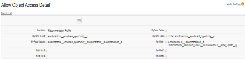 Read -- Create -- Update enrollmentrxrx__enrollment_opportunity__c,enrollmentrxrx__recommendation__cDelete -- Fields [EnrollmentrxRx__Recommendation__c-EnrollmentrxRx__Document_Status__c,Allow_Upload__c]Attention:When any field in the recommendation form is updated through the “button” click, that field needs to be added in the Allow Object Access FormBuilder custom settings. This is required for Summer ’20 and earlier releases only. It’s not required for the Winter ’21 Release.