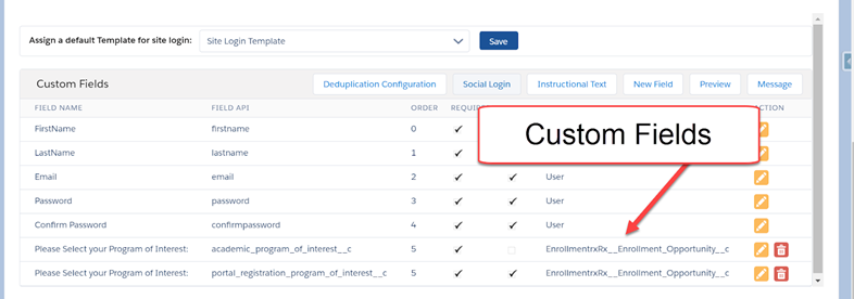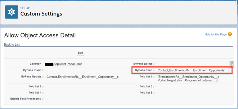 Academic_Term__c) was added it could look like:[EnrollmentrxRx__Enrollment_Opportunity__c-Academic_Program_of_Interest__c,Portal_Registration_Program_of_Interest__c,Academic_Term__c]In the scenario where you have two objects on the registration page, such as the contact and the application you can update the custom setting as shown below (note the text on the field list 1 has both objects and their fields in brackets):