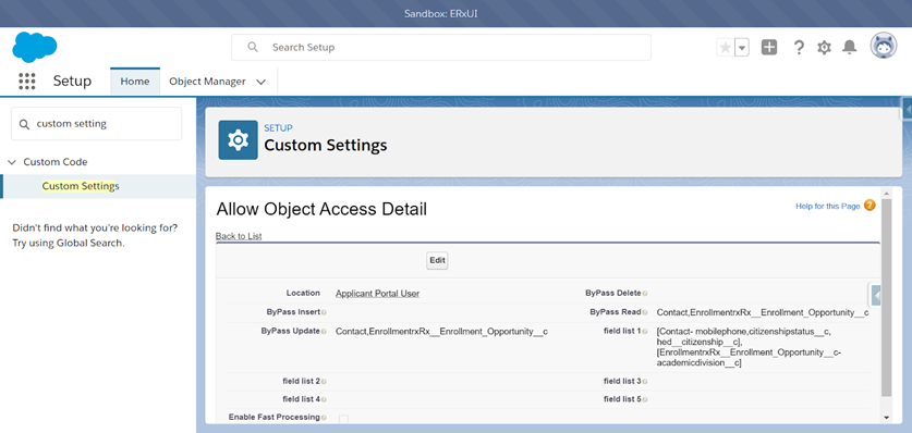 - In your sandbox, update/create the custom setting for Allow Object Access for ERX Core. Note you will need to be on a 2019 version or later. If you are on Core version 2.4.9, this step is not needed. (Make sure to note the instructions, to add any object that will have an attachment to the Bypass Update. For example if you had an attachment on the Recommendation Form you would need to add that object to the Bypass Update.)