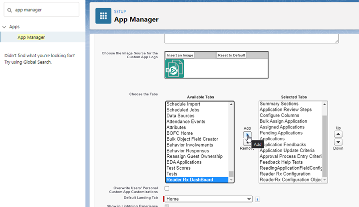 Your Reader Rx admin will need to enable the Approval Process Dashboard tab. Go to Setup and type App Manager in the Quick Find box. Click the Edit button for ERX Reader Rx (you’ll find it in the drop-down list at the end of the row).