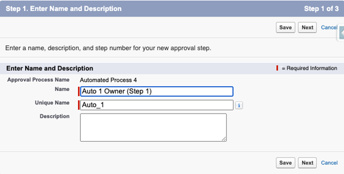 Note:Because only step names display in the “Approval History” related list on the application, you must include the name of the process—or a shortened version of it—in the name of each of the process’ steps. So think long and hard about the names of your processes to make them as concise (short and descriptive) as possible.