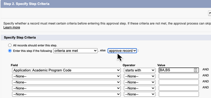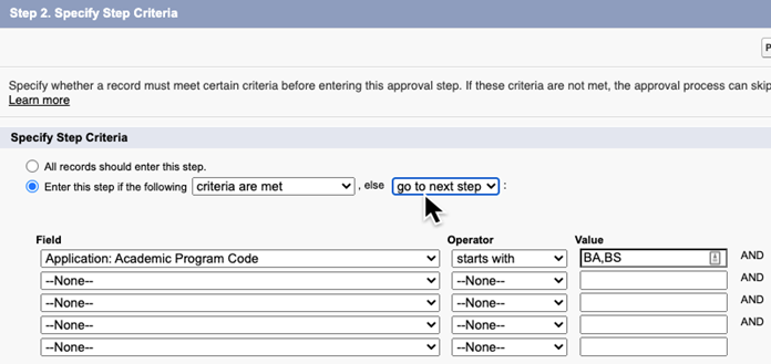 Note:You can only choose “go to next step” if a next step exists, so for each step you will need to set the “Enter this step if the following..., else approve record” like this:Generally speaking, you will want each step of an automatic approval process to be skipped if the application does not satisfy the entry criteria. In that case you will want the application to go to the next step and be evaluated against its entry criteria, and so forth for all the steps of the process.