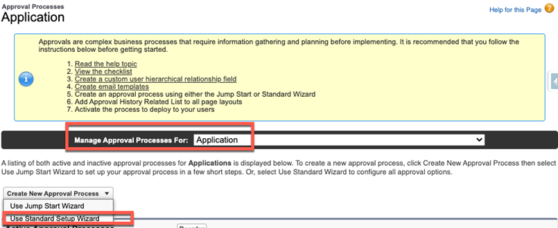 “Application” and click and hold the “Create New Approval Process” button and choose