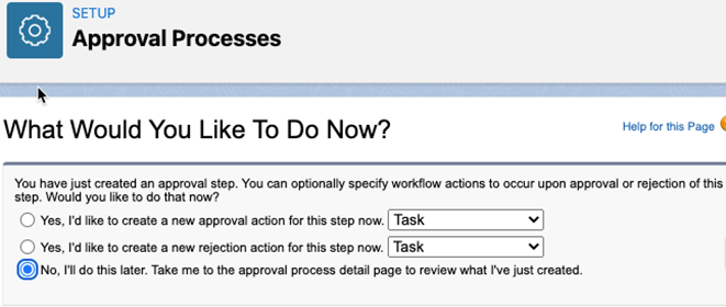 Checking the “Allow submitters to recall approval requests” creates a convenient way for a submitter to recall an application that was submitted in error. If this is checked, then on the related list “Approval History” on the Application page layout, the submitter can use the “recall” action to remove the application from the approval process. - When prompted with the What Would You Like To Do Now? dialog, choose “No,