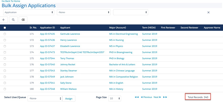 If the “Total Records” in the lower right corner of the Bulk Assign Applications reads “50,000”, then there are more than 50k applications that have not been reviewed in your org. In this case, you should apply filters at the top of the window to reduce the number of results returned.