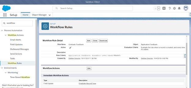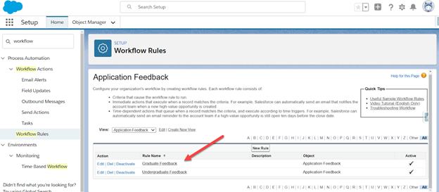 Navigate to the workflows for the Application Feedback object as shown, and click on